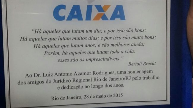 Na tarde de ontem, 28/05, a equipe do Jurídico Rio de Janeiro prestou homenagem aos três colegas que se aposentaram: 1) Maria Lúcia Candiota da Silva  (marialuciacandiota@gmail.com),  2) Luiz Antônio Azamor Rodrigues (lazamor@araujoeazamor.adv.br) e 3) Francisco José Novais Júnior (franzenovais@yahoo.com.br)