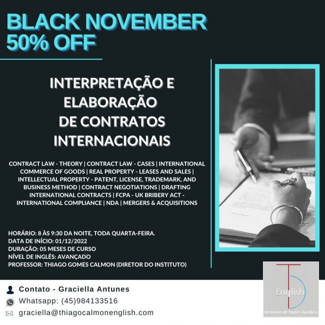 O Instituto de Inglês Jurídico Thiago Calmon, parceiro da Advocef, convida todos para participarem Promoção da Black November – 50% OFF: “Curso de Inglês Jurídico – Interpretação e Elaboração de Contratos Internacionais”. O curso online terá aulas ao vivo, com turmas de no máximo 20 alunos, que aprenderão a interpretar e elaborar contratos em inglês…