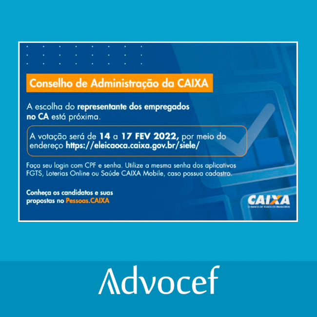 A eleição para representante dos empregados no Conselho de Administração da CAIXA ocorre entre 14 e 17 de fevereiro por meio do endereço https://eleicaoca.caixa.gov.br/siele/ . A votação começa às 8h da segunda-feira (14/2) e vai até 19h da quinta-feira (17/2). A Associação Nacional dos Advogados da Caixa Econômica Federal (Advocef) declarou apoio à candidatura da…