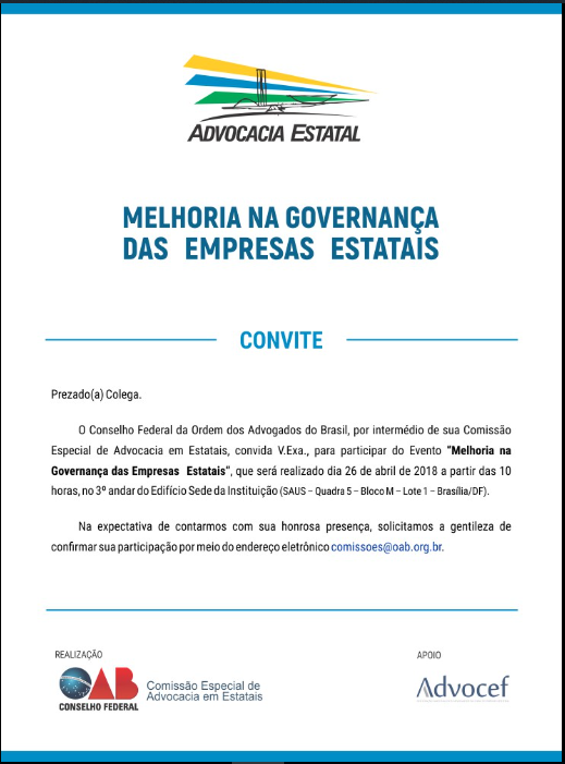 Nessa quinta-feira, 26/04, no horário entre 10:00 e 13:00, ocorrerá o seminário Melhoria da Governança nas Estatais, no Conselho Federal da OAB, em Brasília. O evento é promovido pela Comissão de Advocacia em Estatais do CFOAB e tem o apoio da ADVOCEF. Haverá transmissão ao vivo pelo canal Advocef Oficial no YouTube. Segue o link…