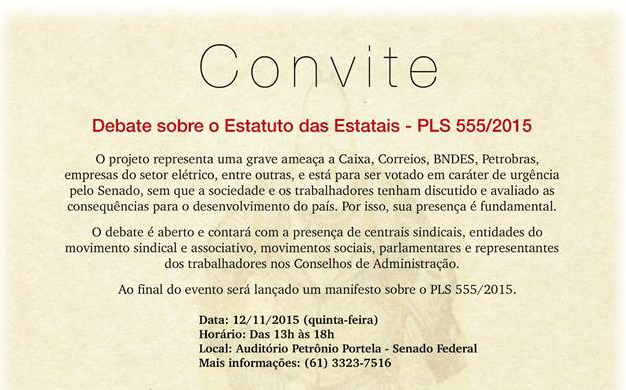 Prezados Associados Nesta quinta-feira, 12/11/2015, a ADVOCEF irá participar no Congresso Nacional do debate sobre o Estatuto das Estatais, consubstanciado no Projeto de Lei do Senado nº 555, de 2015. Tal projeto ameaça seriamente a existência da CAIXA como empresa pública federal. Sob o pretexto de transparência na gestão das empresas, o PLS 555/2015 cria…
