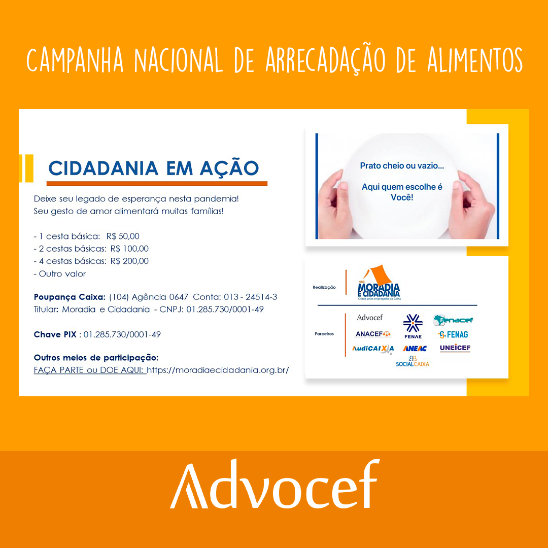 Campanha distribui cestas básicas para pessoas em vulnerabilidade social em todo Brasil. A campanha Cidadania em Ação continua a arrecadação de donativos para a compra de alimentos destinados a pessoas em situação de vulnerabilidade social. As doações voluntárias podem ser feitas por meio da chave Pix: 01.285.730/0001-49 o por meio da conta da ONG Moradia…