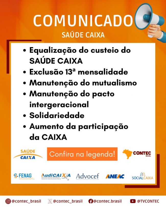 A Advocef enviou à CONTEC uma proposta sobre as condições do Saúde Caixa na terça-feira (17). O material foi elaborado em conjunto com a ANEAC, AUDICAIXA, FENAG, e Social CAIXA e mostra a preocupação das entidades com as discussões do custeio para o plano de saúde. O documento trata, entre outros pontos, da possibilidade de…